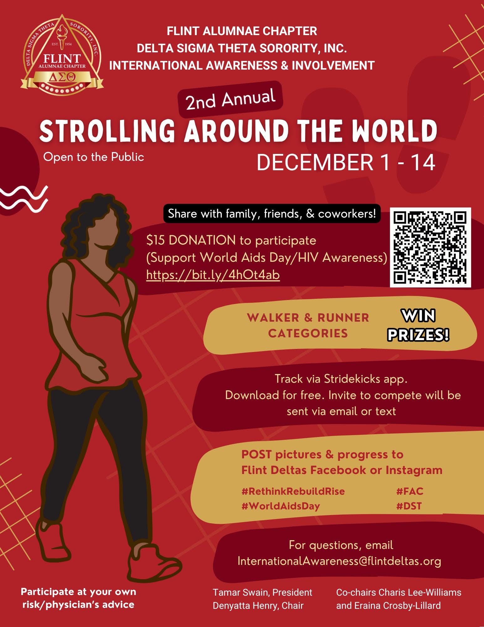 Virtual walking and/or running challenge in support of HIV/AIDS awareness month. This event is open to the public. Prizes will be given to those with the most steps/distance. There will be a walker and runner category. The event will run over 2 weeks, Dec 1st-14th MIDNIGHT TO MIDNIGHT. There is a $15 participation fee and or we will take donations. All proceeds will go towards local HIV/AIDs support organizations and small portion (25%) will go towards DST Delta House at Vashti Village in Swaziland that serves AIDS orphans and a housemother.