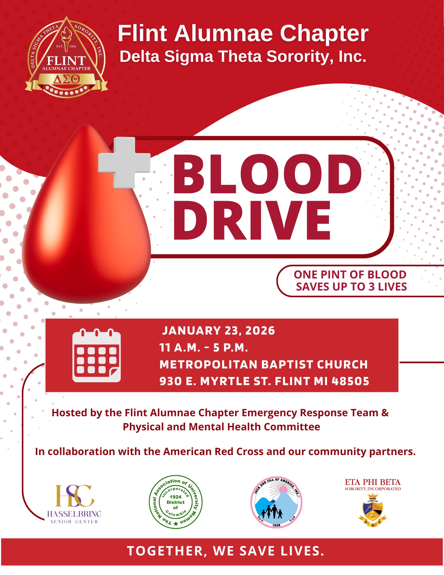 The Flint Alumnae Chapter of Delta Sigma Theta Sorority, Inc. invites the community to join us in a lifesaving mission. Our Emergency Response Team (ERT) Committee and Physical and Mental Health Committee, in partnership with the American Red Cross, are hosting a community blood drive.