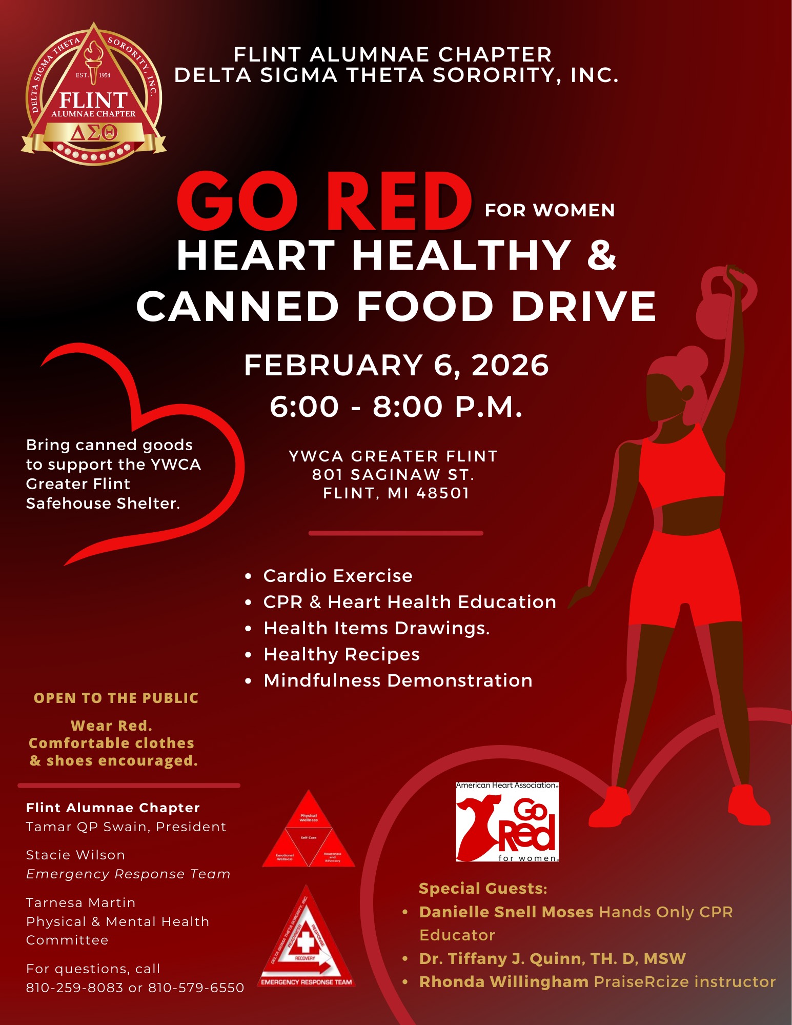 Go RED with us for healthy hearts! This event is to raise awareness, educate, and empower women to prioritize cardio-vascular health while promoting prevention, early detection, and management of heart disease which remains a leading cause of death worldwide. Bring canned goods to support the YWCA Greater Flint Safehouse Shelter. This event is public.